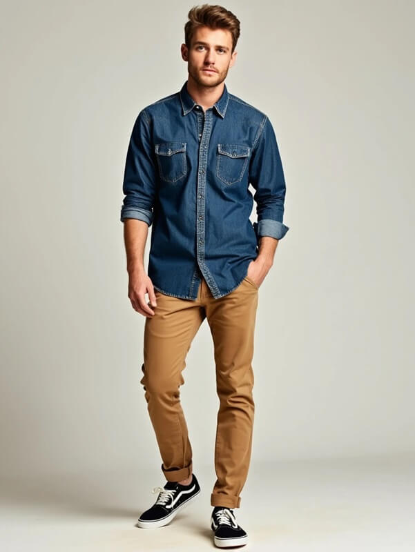 • Cổ điển pha chút bụi bặm: Áo sơ mi denim + quần kaki + giày sneaker. Phong cách này mang đến sự trẻ trung và phóng khoáng, phù hợp cho những buổi dã ngoại hoặc gặp gỡ bạn bè.