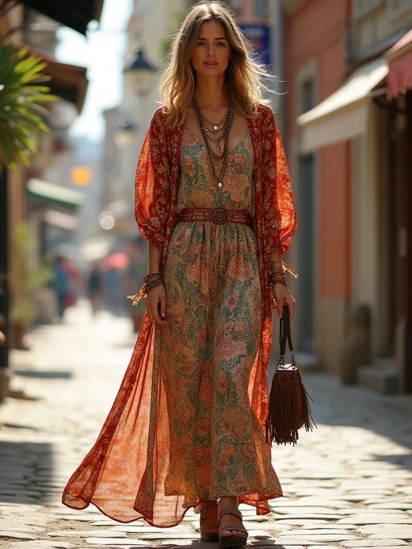 - Váy maxi họa tiết thổ cẩm + áo khoác kimono lụa + sandals đế bệt + vòng cổ to bản + túi xách tua rua. Sự kết hợp này mang đến vẻ đẹp phóng khoáng, tự do và đầy mê hoặc, hoàn hảo cho những buổi dạo phố hay lễ hội âm nhạc ngoài trời
