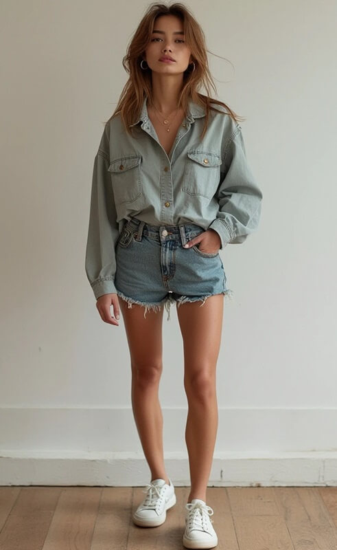 - Áo sơ mi oversized + quần short jeans + giày sneaker: Sự kết hợp thoải mái và năng động, phù hợp cho các hoạt động hàng ngày.