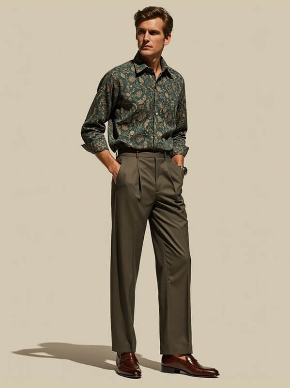 - Áo sơ mi họa tiết + quần tây ống rộng + giày lười: Phong cách cổ điển và lịch lãm, phù hợp cho môi trường công sở hoặc các dịp gặp gỡ quan trọng.