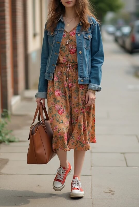 - Váy hoa nhí + áo khoác denim + giày thể thao: Sự kết hợp trẻ trung và năng động, phù hợp cho những buổi dạo phố cuối tuần.